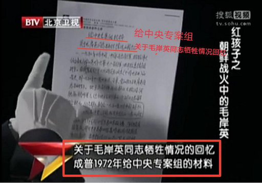 毛岸英的遺孀劉思齊老人,提供了一份毛岸英犧牲親歷者——時(shí)任志愿軍作戰(zhàn)室主任成普1972年親筆寫(xiě)給中央專案組《關(guān)于毛岸英同志犧牲情況的回憶》的材料。