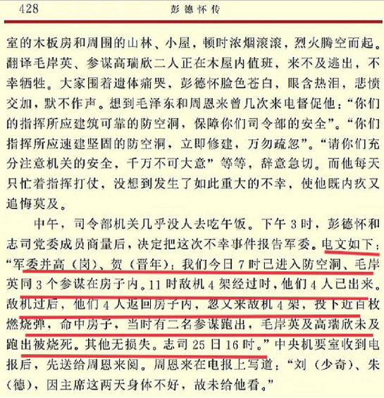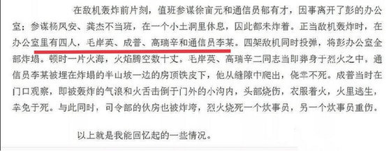 “上午十一點(diǎn)左右,四架美軍轟炸機(jī)嗡嗡略過(guò)志愿軍總部的上空,向北飛去。毛岸英這會(huì)兒也登記,發(fā)完了電報(bào),就從箱子里抓起一個(gè)蘋(píng)果吃起來(lái)。敵機(jī)又從北邊飛回來(lái)了,投下了近百顆凝固汽油彈,毛岸英,高瑞欣兩同志葬身于烈火之中。”