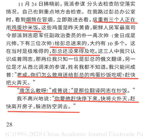 我們來(lái)看一份檔案材料,成普同志在1995年寫(xiě)給《彭德懷傳記》編寫(xiě)組的資料中,里面有這樣一段話:“實(shí)際情況是,彭德懷的床下根本沒(méi)有雞蛋,只有蘋(píng)果。作戰(zhàn)室也根本沒(méi)有飯鍋炒勺,并且,鐵桶火爐上,用一根很長(zhǎng)的鐵皮煙筒直通出房頂鐵皮之上。因此鐵桶火爐根本不能做飯,這樣他們?cè)鯓幼鲭u蛋炒飯吃?不知是何人提供的這種資料,簡(jiǎn)直是天大的謊言?!?/p>