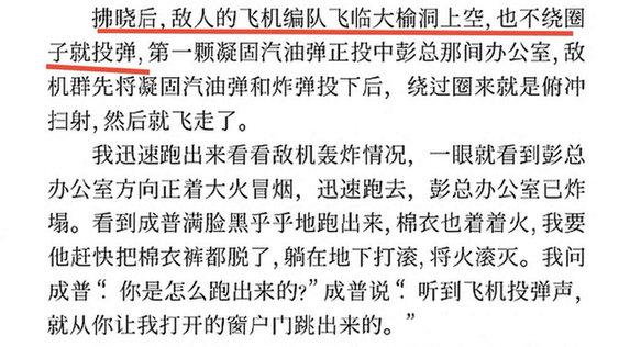 之后,讓人沒(méi)有想到的是,敵機(jī)又從北邊飛了回來(lái)。再一次飛到作戰(zhàn)室的上空。此時(shí),彭德懷已離開(kāi)作戰(zhàn)室,成普馬上跨出西邊的門(mén)檻,一只腳還沒(méi)跨出門(mén)外,抬頭一看,發(fā)現(xiàn)四架敵機(jī)正在以水平投彈式投下了大量銀白色的凝固汽油彈。