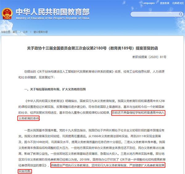 教育部表示,《中華人民共和國(guó)義務(wù)教育法》明確指出,國(guó)家實(shí)行九年義務(wù)教育制度。我國(guó)義務(wù)教育階段和普通高中共12年的課程設(shè)置是經(jīng)過長(zhǎng)期實(shí)踐、反復(fù)調(diào)整后逐步建立的,符合目前國(guó)際上普遍做法,基本與當(dāng)前和今后一個(gè)時(shí)期國(guó)家的社會(huì)、經(jīng)濟(jì)發(fā)展?fàn)顩r相適應(yīng),基本符合兒童身心發(fā)展規(guī)律和認(rèn)知規(guī)律,目前還不具備縮短學(xué)制和將普通高中納入義務(wù)教育的條件。