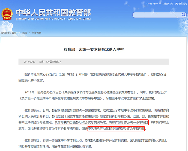 教育部表示,目前,各省份按照教育部的統(tǒng)一部署和要求,陸續(xù)出臺(tái)了本地中考改革的實(shí)施意見,明確將體育科目納入錄取計(jì)分科目,但具體考核項(xiàng)目由各地結(jié)合實(shí)際情況確定,沒有將游泳作為統(tǒng)一必考項(xiàng)目。有的地方結(jié)合實(shí)際,因地制宜將游泳作為體育科目考核項(xiàng)目,并不代表所有地區(qū)都必須將游泳作為考核項(xiàng)目。