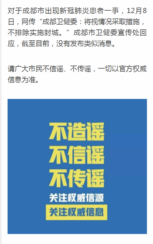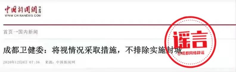 12月8日,對(duì)于成都市出現(xiàn)新冠肺炎患者一事,流傳出疑似中國(guó)新聞網(wǎng)所發(fā)“成都衛(wèi)健委:將視情況采取措施,不排除實(shí)施封城”的消息。