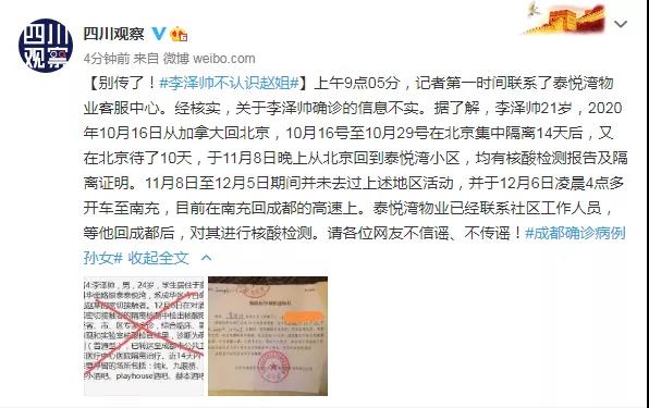 謠言一 網(wǎng)傳成都高新區(qū)李某為新增新冠肺炎確診病例?
