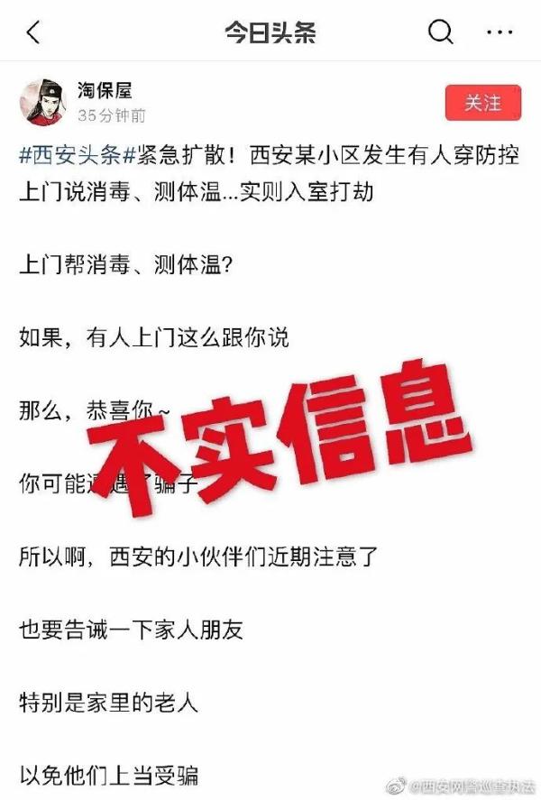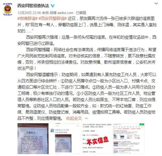 12月28日夜間,西安市公安局網(wǎng)絡(luò)安全保衛(wèi)支隊官方微博發(fā)布消息稱,近日朋友圈再次流傳一張已被多次辟謠的謠言圖片,稱“現(xiàn)在有一幫人,穿著防疫服上門,說是上門消毒、測體溫,其實是入室搶劫的......”