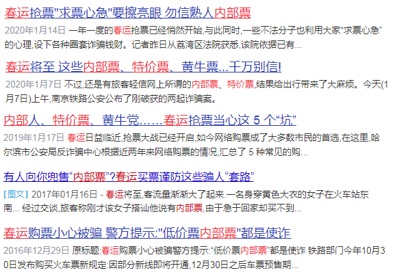 以“春運”“內(nèi)部票”等關(guān)鍵詞在搜索引擎搜索,可以看到幾乎每年都有乘客輕信相關(guān)謠言而上當(dāng)受騙的例子。查看相關(guān)案例不難發(fā)現(xiàn),不法分子往往利用乘客急于買票的心理,謠稱“有鐵路內(nèi)部關(guān)系,可以買到內(nèi)部票”,實施詐騙。而乘客花高價購買的所謂“內(nèi)部票”純屬假票,無法通過火車站閘機檢票進站乘車。