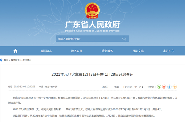 事實上,廣東省人民政府網(wǎng)站在12月3日發(fā)布的《2021年元旦火車票12月3日開售 1月28日開啟春運》文章中明確表示:1月28日,開啟為期40天的2021年春運模式。