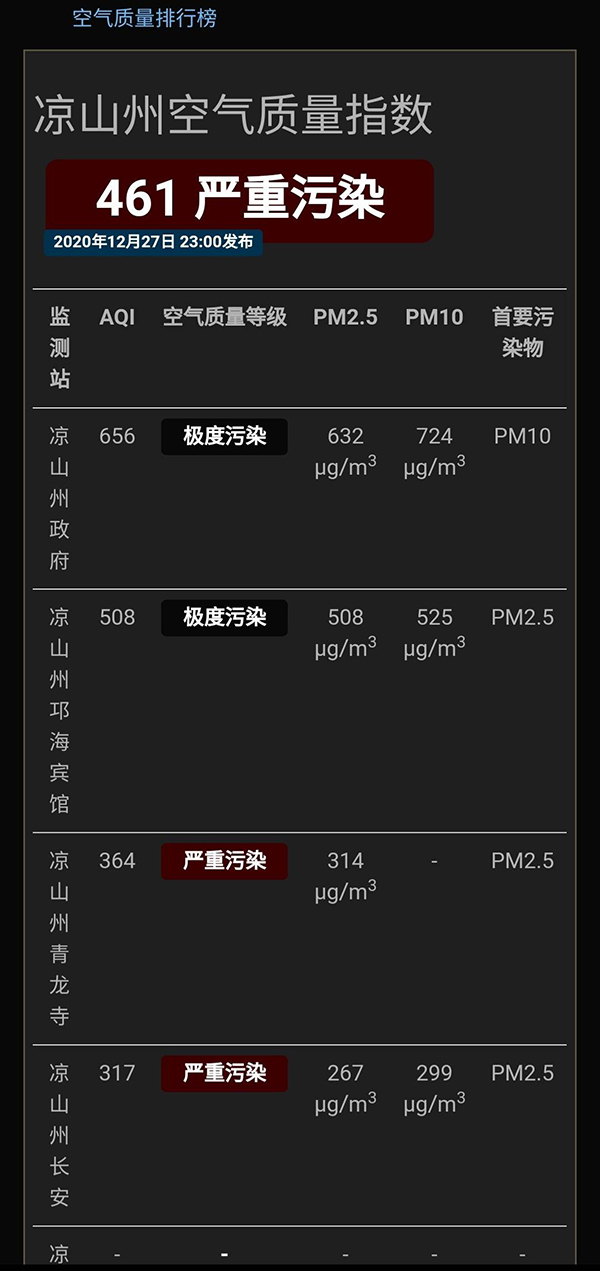 計(jì)劃燒除,以及持續(xù)靜風(fēng)逆溫等不利氣象條件,也讓空氣質(zhì)量一向優(yōu)良的涼山州西昌市,連續(xù)出現(xiàn)重度污染到嚴(yán)重污染天氣。