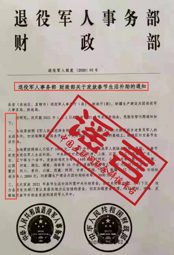 近日,網(wǎng)上有消息稱,“退伍軍人事務(wù)部、財(cái)政部聯(lián)合發(fā)文,要求各地給退伍軍人發(fā)放春節(jié)補(bǔ)助。不同地區(qū)發(fā)放標(biāo)準(zhǔn)一一明確......”。對(duì)此,中國(guó)互聯(lián)網(wǎng)聯(lián)合辟謠平臺(tái)向退役軍人事務(wù)部有關(guān)部門求證,證實(shí)此為謠言!