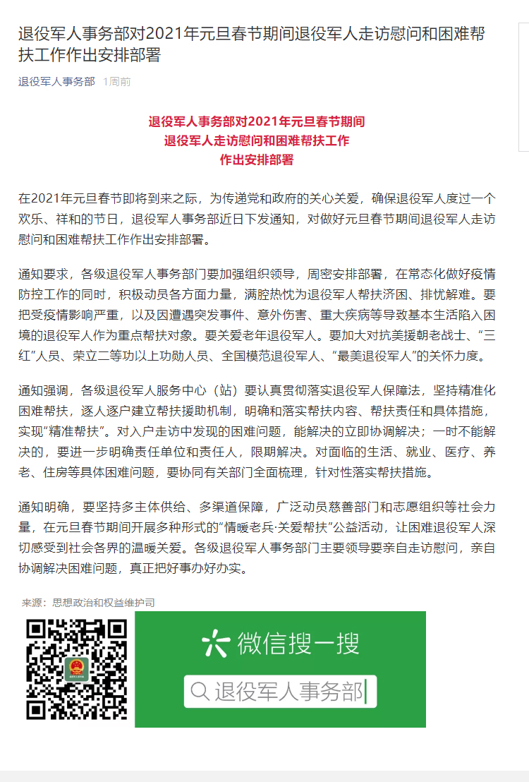 該“文件”的出現(xiàn),顯然是借元旦春節(jié)期間各地走訪、慰問和幫扶退役軍人來炒熱度。實(shí)際上,2020年12月31日退役軍人事務(wù)部官方微信已發(fā)布相關(guān)工作安排,指出各級(jí)退役軍人服務(wù)中心(站)要認(rèn)真貫徹落實(shí)退役軍人保障法,堅(jiān)持精準(zhǔn)化困難幫扶,逐人逐戶建立幫扶援助機(jī)制,明確和落實(shí)幫扶內(nèi)容、幫扶責(zé)任和具體措施,實(shí)現(xiàn)“精準(zhǔn)幫扶”。至于網(wǎng)傳的發(fā)放補(bǔ)貼以及標(biāo)準(zhǔn),并未提及。