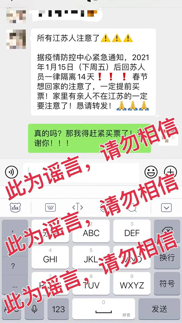 臨近春運(yùn),疫情防控形勢(shì)日益嚴(yán)峻,與返鄉(xiāng)回程相關(guān)的謠言開(kāi)始出現(xiàn)。日前,就有一條關(guān)于來(lái)蘇返蘇人員入蘇隔離的信息在微信等社交媒體上傳播開(kāi)來(lái)。