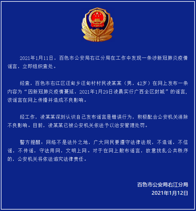 2021年1月11日,百色市公安局右江分局在工作中發(fā)現(xiàn)一條涉新冠肺炎疫情謠言,立即組織查處。
