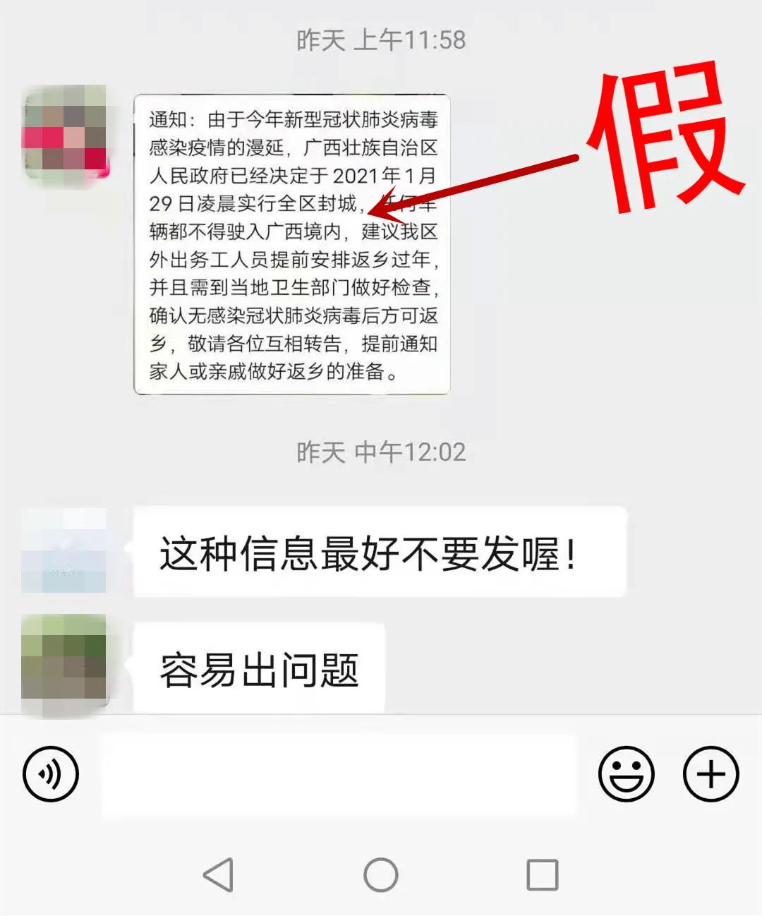 2021年1月12日,廣西上林縣公安局網(wǎng)安大隊在日常網(wǎng)絡(luò)巡查工作中發(fā)現(xiàn),上林一網(wǎng)友于1月11日在某微信群中發(fā)布關(guān)于疫情的不實信息:“由于今年新型冠狀病毒感染的肺炎疫情蔓延,廣西壯族自治區(qū)人民政府已經(jīng)決定于2021年1月29日凌晨實行全區(qū)封城,任何車輛都不得駛?cè)霃V西境內(nèi)…...”