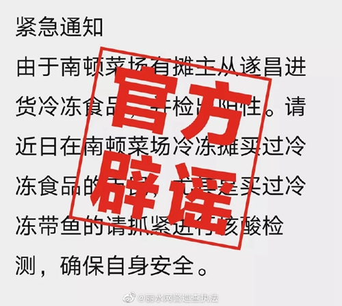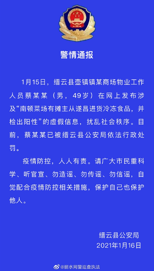 1月15日,縉云縣壺鎮(zhèn)鎮(zhèn)某商場物業(yè)工作人員蔡某某(男,49歲)在網(wǎng)上發(fā)布涉及“南頓菜場有攤主從遂昌進(jìn)貨冷凍食品,并檢出陽性”的虛假信息,擾亂社會秩序。目前,蔡某某已被縉云縣公安局依法行政處罰。