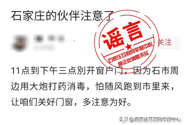 近日,網(wǎng)絡(luò)流傳著一則“11點到下午三點別開門窗,因為石市周邊用大炮打藥消毒,怕隨風跑到市里來,讓咱們關(guān)好門窗,多注意為好”的消息,經(jīng)石家莊互聯(lián)網(wǎng)舉報中心向市防疫相關(guān)部門核實,該消息為謠言。