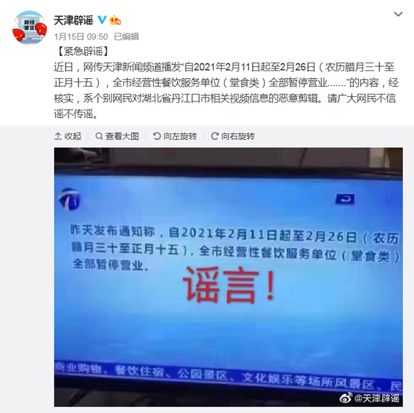 另外,1月15日,天津辟謠了“2021年2月11日至2月26日,天津市經(jīng)營性餐飲服務(wù)單位(堂食類)全部暫停營業(yè)”的消息。
