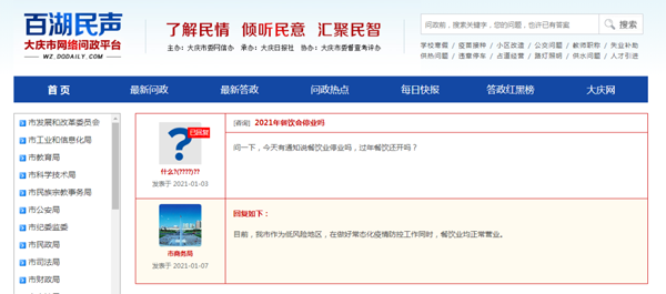 1月7日,大慶市商務(wù)局在網(wǎng)絡(luò)問政平臺百湖民聲上回復(fù)網(wǎng)友提問:在做好常態(tài)化疫情防控工作同時,餐飲業(yè)均正常營業(yè)。