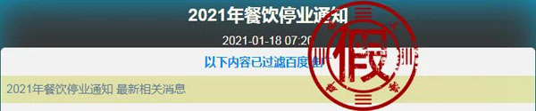 近日,網(wǎng)上流傳出一則“2021年餐飲停業(yè)通知”,打著沈陽市政府新聞發(fā)布會的旗號稱“疫情中高風(fēng)險地區(qū)餐飲業(yè)會停業(yè)”。網(wǎng)傳消息稱,沈陽、大連、北京、石家莊等地的餐廳已經(jīng)停業(yè)了。甚至還有人把去年的通知改個日期,稱“今年春節(jié)餐飲經(jīng)營場所繼續(xù)暫停營業(yè)”。