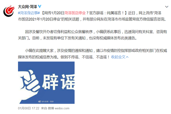 1月8日,山東菏澤也辟謠了“1月20日菏澤飯店停業(yè)”的相關(guān)消息。