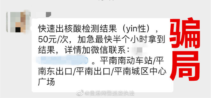 近期,有網(wǎng)民向貴港網(wǎng)警反映,在本地一些聊天群里出現(xiàn)了“快速出核酸檢測結(jié)果,加急最快半個小時拿到結(jié)果”的信息。