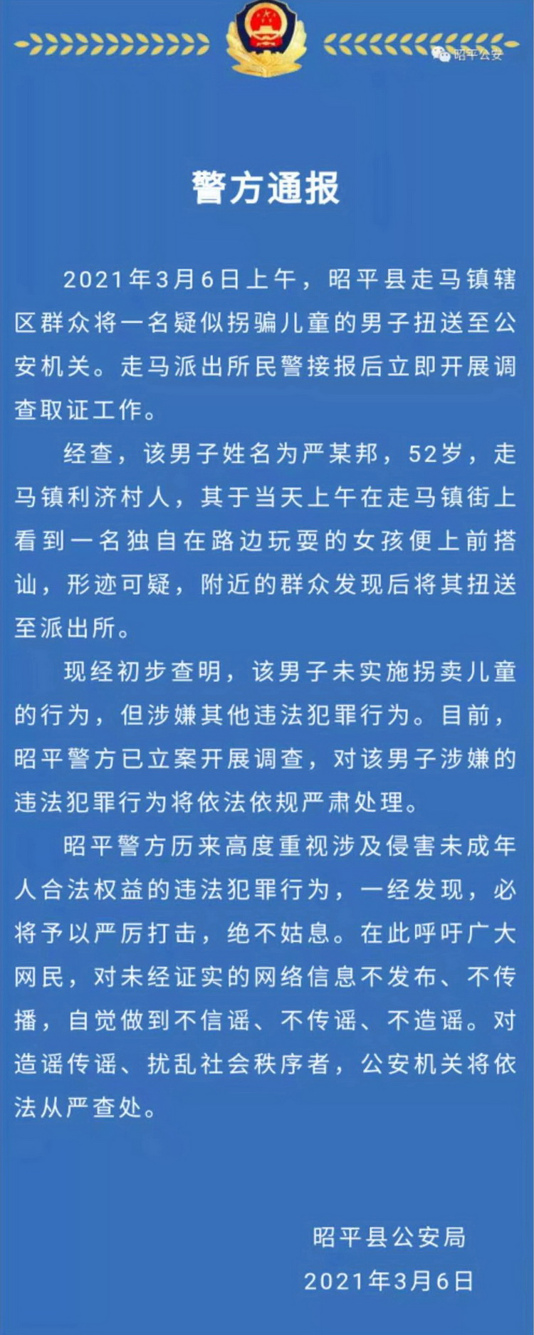 經(jīng)查,該男子姓名為嚴某邦,52歲,走馬鎮(zhèn)利濟村人,其于當天上午在走馬鎮(zhèn)街上看到一名獨自在路邊玩耍的女孩便上前搭訕,形跡可疑,附近的群眾發(fā)現(xiàn)后將其扭送至派出所。