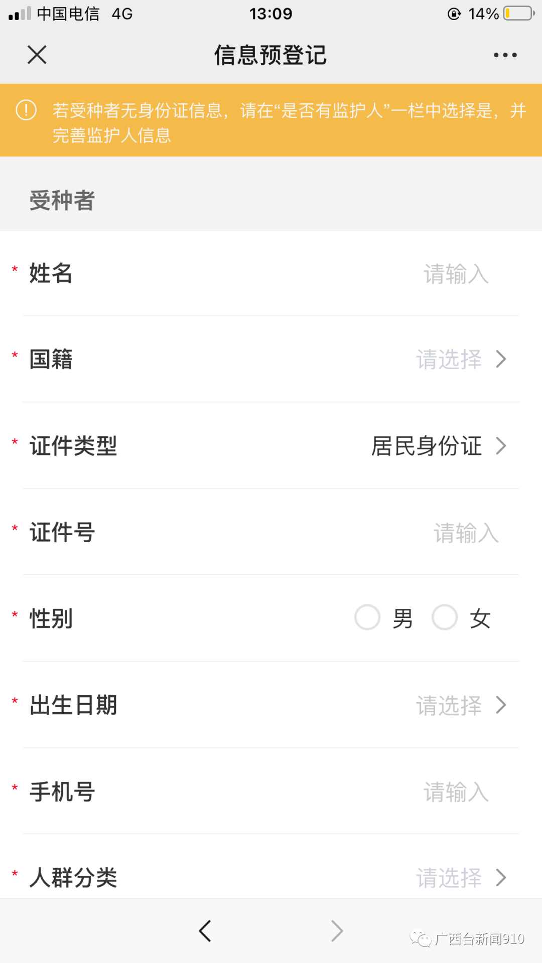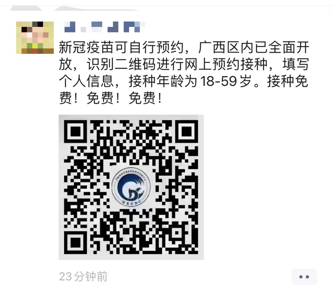 近日,微信朋友圈流傳一則消息稱:新冠疫苗可自行預約,廣西區(qū)內已全面開放,識別二維碼進行網上預約接種,填寫個人信息,接種年齡為18-59歲。接種免費!免費!免費!