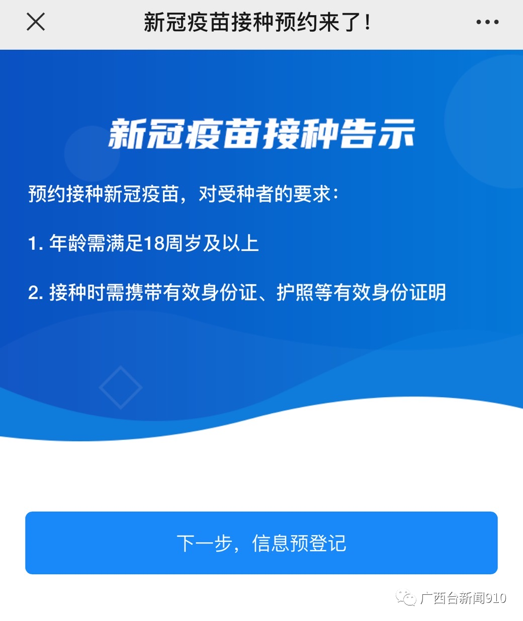 新聞910記者通過識別該二維碼進入預約頁面,頁面顯示預約接種新冠疫苗,對接種者的要求:1、年齡需滿足18周歲及以上;2、接種時需攜帶有效身份證、護照等有效身份證明。