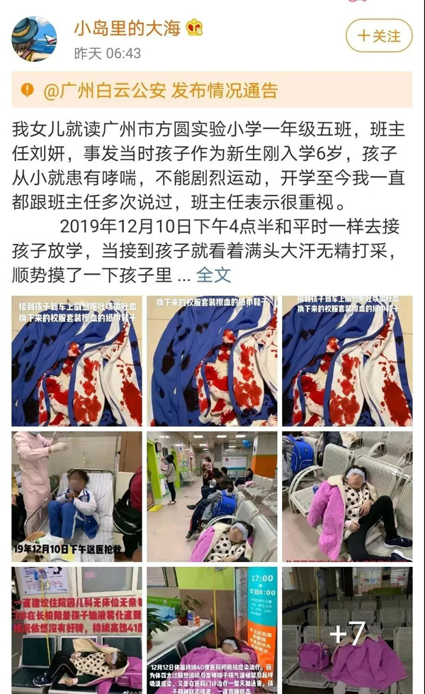 大家是否還記得去年微博上的一個熱點事件:一名廣州的家長發(fā)帖,稱女兒被老師體罰致吐血送醫(yī)搶救,隨文還附有數(shù)張血衣的圖片。