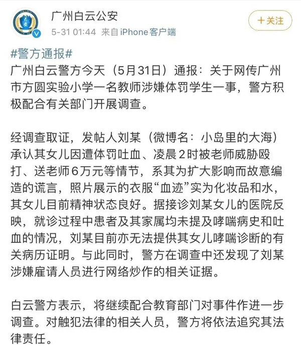 經(jīng)調(diào)查,網(wǎng)民“小島里的大?!背姓J“體罰吐血、威脅毆打、送禮6萬元”等情節(jié)確系其編造,她同時還雇傭了“網(wǎng)絡水軍”增加轉發(fā)、點贊數(shù)量。對此,廣州白云公安第一時間固定證據(jù)并發(fā)布警方通報予以澄清。