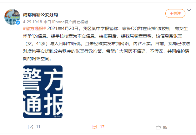2021年4月20日,四川省成都市高新區(qū)某中學(xué)報(bào)警稱:家長QQ群在傳播“該校初二有女生懷孕”的信息,經(jīng)學(xué)校核查為不實(shí)信息。成都市高新公安分局接到報(bào)警后,經(jīng)調(diào)查查明,該信息系張某(女,41歲)與人閑聊中聽說,且未經(jīng)核實(shí)發(fā)布到網(wǎng)絡(luò),內(nèi)容不實(shí)。目前,成都市高新公安分局已依法對(duì)虛構(gòu)事實(shí)擾亂公共秩序的張某行政拘留。希望廣大網(wǎng)民不信謠、不傳謠,共同維護(hù)清朗的網(wǎng)絡(luò)空間。