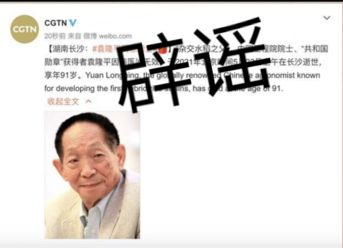 5月22日上午,網(wǎng)傳袁隆平院士去世,經(jīng)人民網(wǎng)記者與袁隆平大兒子袁定安先生確認,這是一個假消息。袁隆平目前因病正在長沙某醫(yī)院治療。