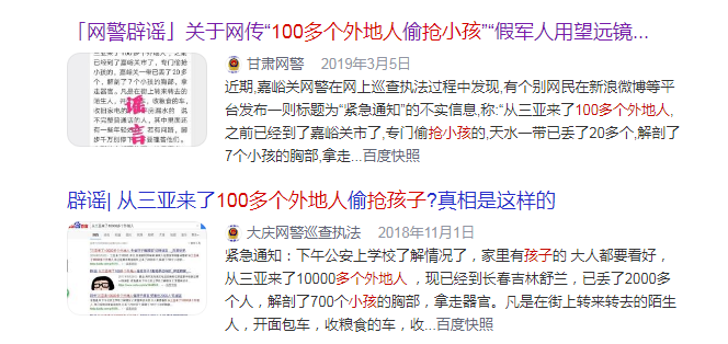 經(jīng)搜索發(fā)現(xiàn),這個(gè)“100多個(gè)外地人偷或搶小孩”的謠言已經(jīng)在多個(gè)地方,換著花樣傳了多年。有說(shuō)這“100多個(gè)外地人”來(lái)自三亞,也有說(shuō)來(lái)自呼和浩特,還有說(shuō)來(lái)自新疆等。而被傳搶孩子的地方就更多了,有云南西雙版納、楚雄、浙江龍游、廣東珠海、惠州、湖北鄂州、四川雅安、甘肅天水、山西忻州、山東菏澤等10多個(gè)地方。