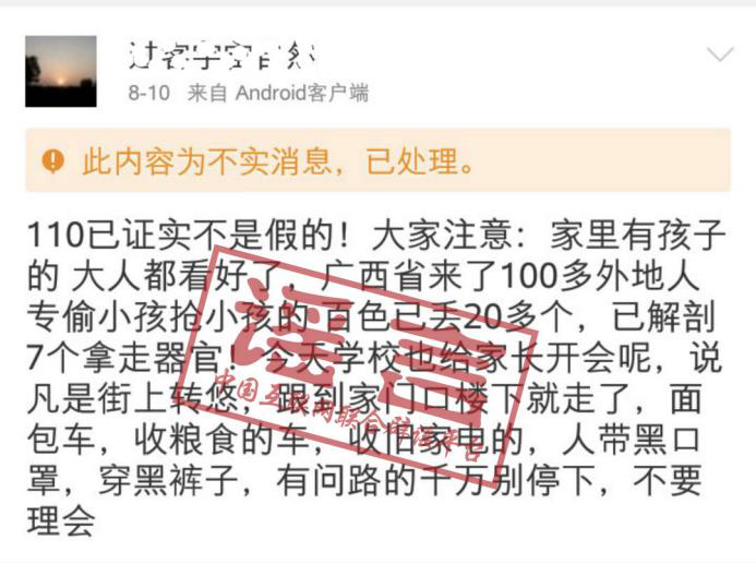 經(jīng)查證追溯發(fā)現(xiàn),網(wǎng)絡(luò)上較早出現(xiàn)該謠言的時(shí)間是2015年8月份,有網(wǎng)民發(fā)布關(guān)于“廣西省來(lái)了100多外地人,專(zhuān)偷小孩搶小孩的,百色已丟20多個(gè),已解剖7個(gè)拿走器官”的消息。經(jīng)柳州網(wǎng)警核查,此消息為虛假消息。