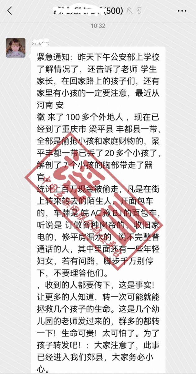 近日,中國(guó)互聯(lián)網(wǎng)聯(lián)合辟謠平臺(tái)接到網(wǎng)民舉報(bào),稱(chēng)網(wǎng)上有多個(gè)群在轉(zhuǎn)發(fā)“從河南、安徽來(lái)了100多人搶小孩”等信息。傳言駭人聽(tīng)聞,稱(chēng)100多外地人現(xiàn)在已經(jīng)到了重慶,梁平、豐都一帶,已經(jīng)發(fā)現(xiàn)丟了20多個(gè)小孩,7個(gè)小孩器官被摘取……
