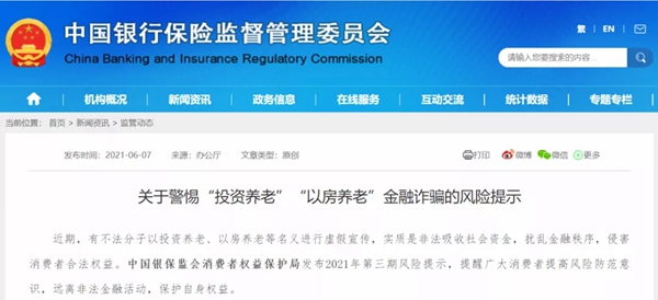這是繼5月發(fā)布《關(guān)于養(yǎng)老領(lǐng)域非法集資的風(fēng)險(xiǎn)提示》后,銀保監(jiān)會再次發(fā)文警示養(yǎng)老領(lǐng)域非法金融活動。