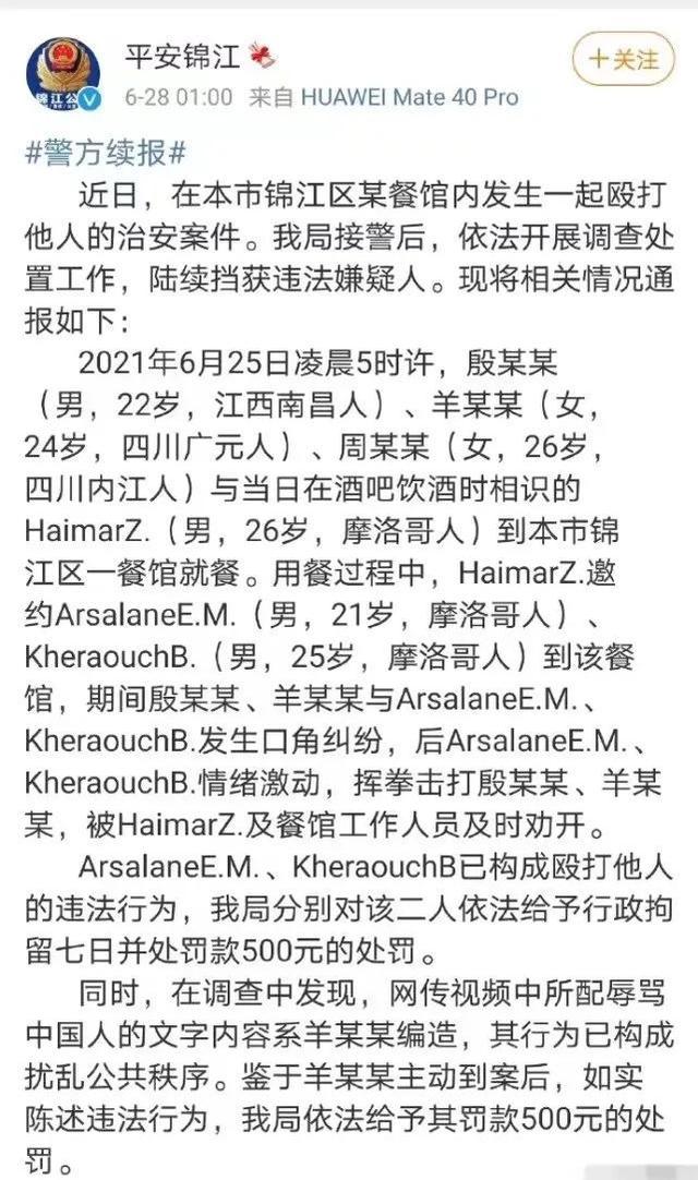 6月28日凌晨,四川省成都市公安局錦江分局在其官方微博發(fā)文,通報(bào)了該區(qū)某餐館內(nèi)發(fā)生的一起治安案件,通報(bào)全文如下: