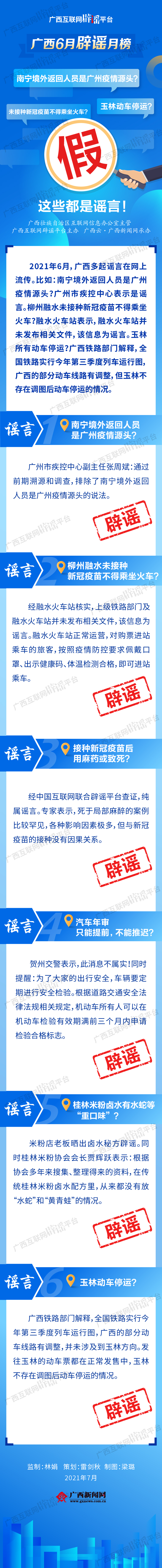 2021年6月,廣西多起謠言在網上流傳。比如:南寧境外返回人員是廣州疫情源頭?廣州市疾控中心表示是謠言。柳州融水未接種新冠疫苗不得乘坐火車?融水火車站表示,融水火車站并未發(fā)布相關文件,該信息為謠言。玉林所有動車停運?廣西鐵路部門解釋,全國鐵路實行今年第三季度列車運行圖,廣西的部分動車線路有調整,但玉林不存在調圖后動車停運的情況。廣西互聯(lián)網辟謠平臺為您盤點6月廣西辟謠信息,一起來了解真相。