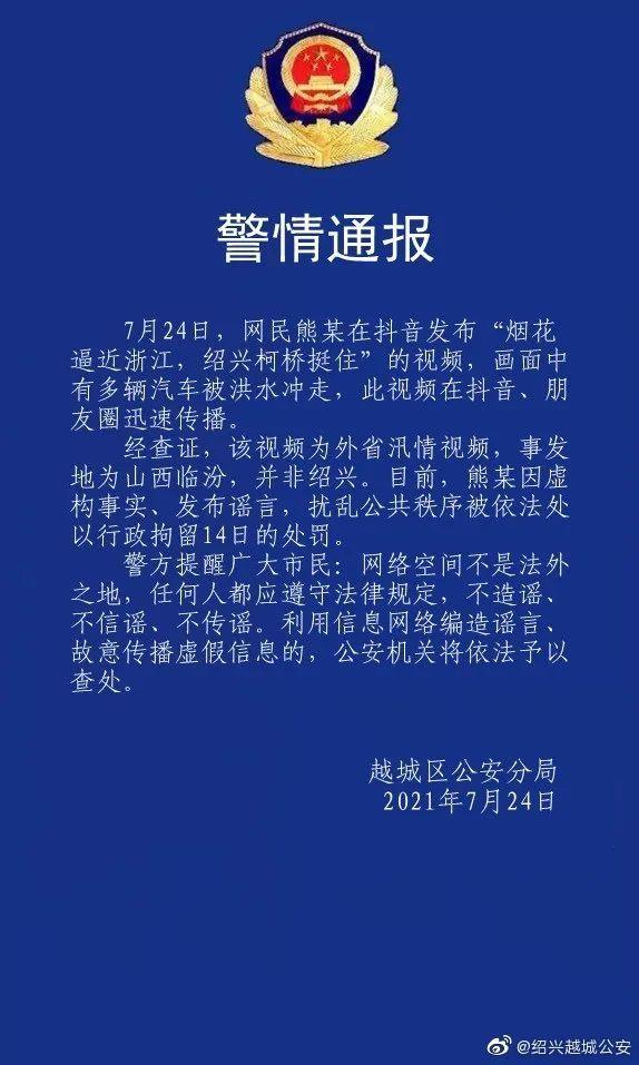 昨天23:46,@紹興越城公安 發(fā)布《警情通報》:發(fā)布謠言,行政拘留14天!希望廣大群眾擦亮雙眼,不信謠不傳謠,平安度過臺風天!