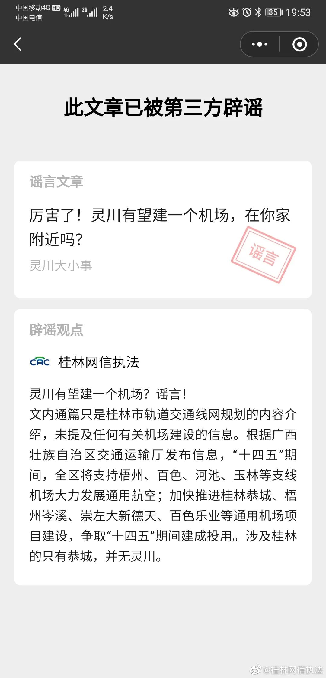 微信公眾號【靈川大小事】 2021年7月26日發(fā)布謠言信息【厲害了!靈川有望建一個機場,在你家附近嗎?】,桂林網(wǎng)信辦予以辟謠,微信公眾平臺對該公眾號進行處罰。