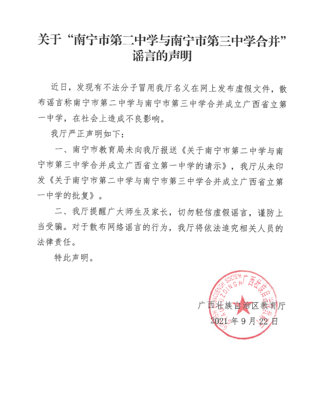 自治區(qū)教育廳關(guān)于“南寧市第二中學(xué)與南寧市第三中學(xué)合并”謠言的聲明全文如下: