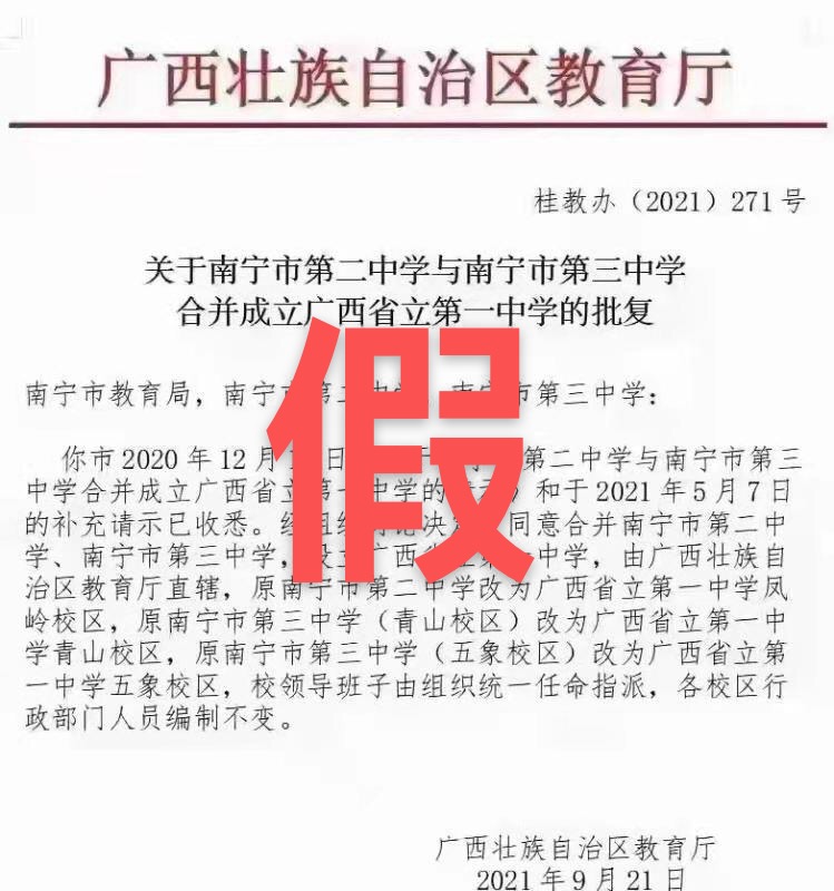 廣西互聯(lián)網(wǎng)辟謠平臺(tái)從自治區(qū)教育廳處證實(shí),該消息為假消息。22日下午,自治區(qū)教育廳發(fā)表聲明證實(shí)“南寧二中與南寧三中合并”系謠言。在聲明中,自治區(qū)教育廳表示南寧市教育局未向自治區(qū)教育廳報(bào)送《關(guān)于南寧市第二中學(xué)與南寧市第三中學(xué)合并成立廣西省立第一中學(xué)的請(qǐng)示》的文件,且自治區(qū)教育廳從未印發(fā)《關(guān)于南寧市第二中學(xué)與南寧市第三中學(xué)合并成立廣西省立第一中學(xué)的批復(fù)》的文件。