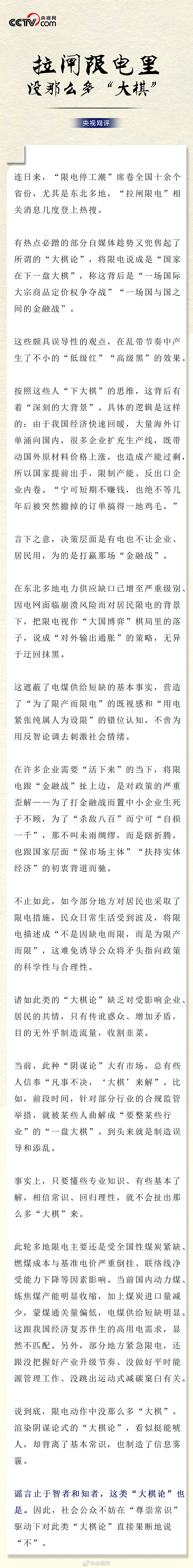 在最近“限電停工潮”中,所謂“大棋論”遮蔽了電煤供給短缺的基本事實,營造了“為了限產而限電”的既視感和“用電緊張純屬人為設限”的錯位認知,不啻為用反智論調去刺激社會情緒。在亂帶節(jié)奏中產生了不小的“低級紅”“高級黑”的效果。對此,我們應在“尊崇常識”驅動下對此類“大棋論”直接果斷地說“不”。