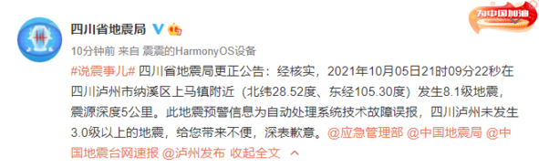 四川省地震局更正公告:經(jīng)核實,2021年10月05日21時09分22秒在四川瀘州市納溪區(qū)上馬鎮(zhèn)附近(北緯28.52度、東經(jīng)105.30度)發(fā)生8.1級地震,震源深度5公里。此地震預警信息為自動處理系統(tǒng)技術(shù)故障誤報,四川瀘州未發(fā)生3.0級以上的地震,給您帶來不便,深表歉意。