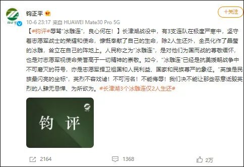 10月6日,解放軍媒體官方微博賬號@鈞正平 發(fā)表評論《辱罵“冰雕連”,良心何在!》,全文如下: