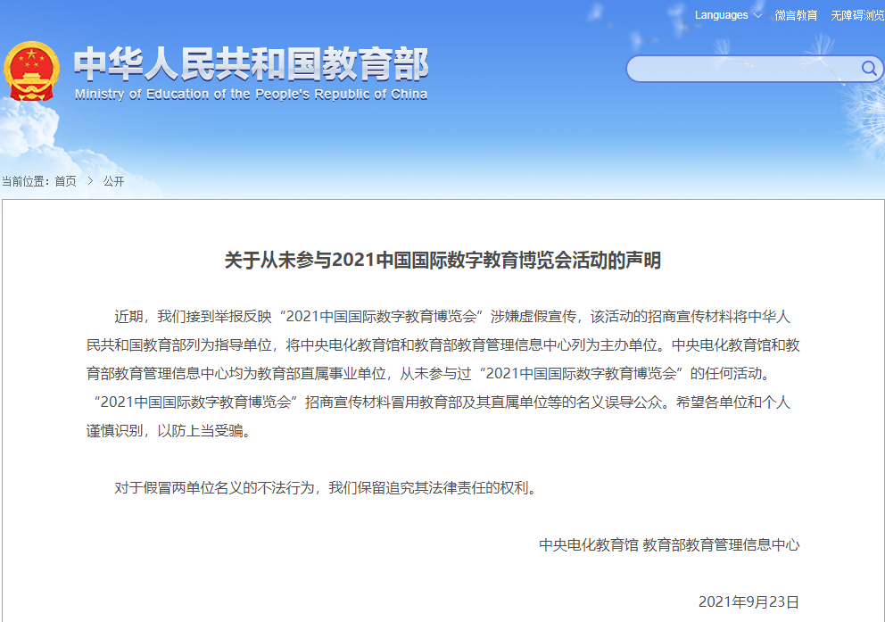 關(guān)于從未參與2021中國(guó)國(guó)際數(shù)字教育博覽會(huì)活動(dòng)的聲明