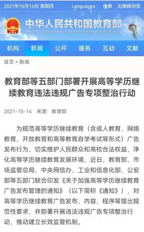 為規(guī)范高等學(xué)歷繼續(xù)教育(含成人教育、網(wǎng)絡(luò)教育、開放教育和高等教育自學(xué)考試等形式)廣告發(fā)布行為,切實維護(hù)人民群眾和高校合法權(quán)益,凈化高等學(xué)歷繼續(xù)教育發(fā)展環(huán)境,近日,教育部、市場監(jiān)管總局、中央網(wǎng)信辦、工業(yè)和信息化部、公安部等五部門聯(lián)合印發(fā)《關(guān)于加強高等學(xué)歷繼續(xù)教育廣告發(fā)布管理的通知》(以下簡稱《通知》),對高等學(xué)歷繼續(xù)教育廣告發(fā)布、內(nèi)容、程序等提出規(guī)范性要求,并部署開展違法違規(guī)廣告專項整治行動,推動建立長效監(jiān)管機制。