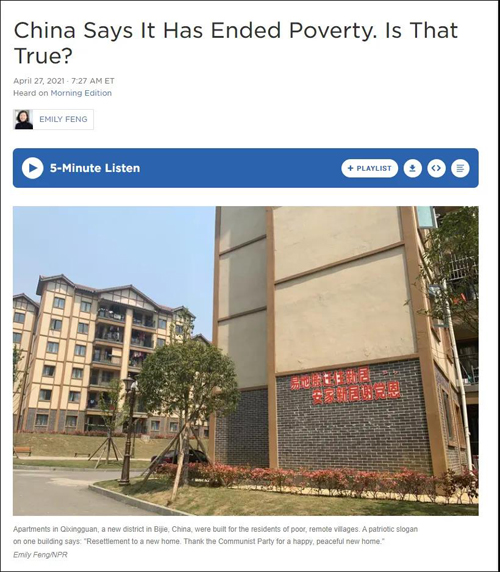今年4月,美國國家公共電臺刊發(fā)了該新聞臺駐京記者華裔馮哲蕓對于畢節(jié)的“秘密”采訪。在這篇題目為《中國脫貧是真是假?》的報道中,馮哲蕓前往七星關的一個社區(qū),采訪了幾名居民,通過對幾個受訪居民的采訪內(nèi)容斷章取義,來質(zhì)疑畢節(jié)“脫貧摘帽”的真實性。