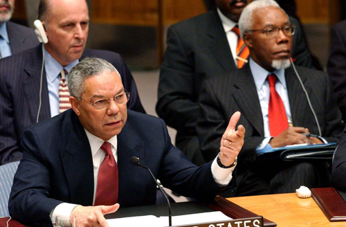 2003年2月5日,時(shí)任美國(guó)國(guó)務(wù)卿鮑威爾在聯(lián)合國(guó)安理會(huì)就伊拉克問題舉行的公開會(huì)議上向安理會(huì)通報(bào)有關(guān)伊拉克藏匿大規(guī)模殺傷性武器的證據(jù)。(新華社記者彭張青攝)