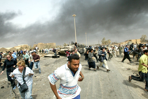2003年4月6日,美英聯(lián)軍出動(dòng)戰(zhàn)機(jī)再次對(duì)伊拉克首都巴格達(dá)轟炸時(shí),許多市民冒著濃濃的煙霧四處逃散。(新華社發(fā))