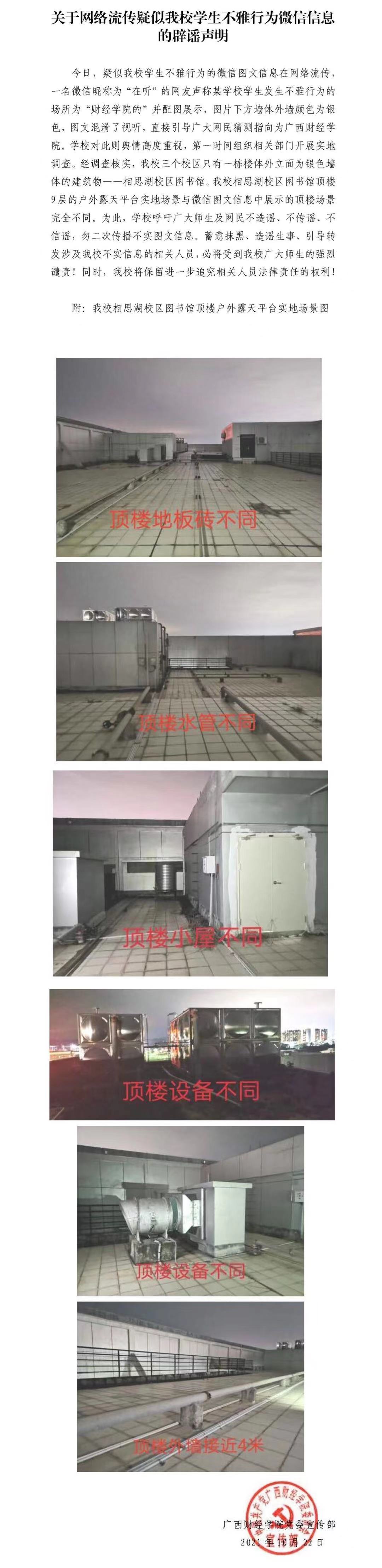 昨日,疑似廣西財(cái)經(jīng)學(xué)院學(xué)生不雅行為的微信圖文信息在網(wǎng)絡(luò)流傳,一名微信昵稱為“在聽”的網(wǎng)友聲稱某學(xué)校學(xué)生發(fā)生不雅行為的場所為“財(cái)經(jīng)學(xué)院”的并配圖展示,圖片下方墻體外墻顏色為銀色,圖文混淆了視聽,直接引導(dǎo)廣大網(wǎng)民猜測指向?yàn)閺V西財(cái)經(jīng)學(xué)院。